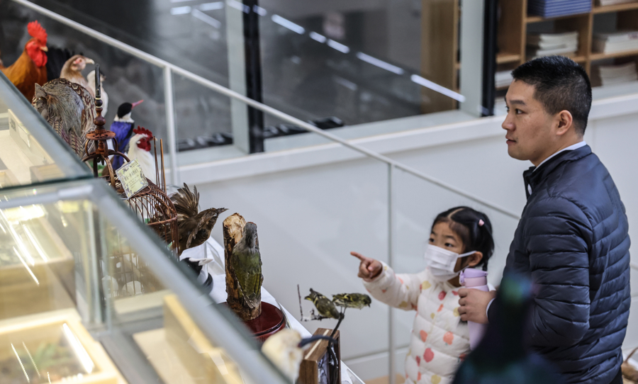 图为与爸爸一起参与制作标本的小朋友兴奋地前来观看自己入选大展的作品。