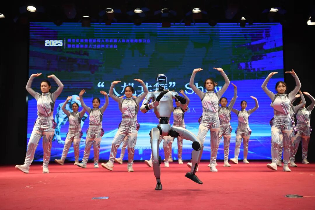 首都师范大学附属中学(通州校区)学生舞蹈团和人形机器人一起跳舞。新华社记者 马宁 摄