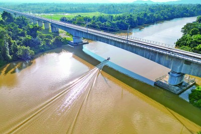 马东铁项目是中马两国共建“一带一路”合作旗舰项目。图为2025年10月10日在马来西亚彭亨州拍摄的马来西亚东海岸铁路的一座桥梁(无人机照片)。新华社记者 程一恒摄